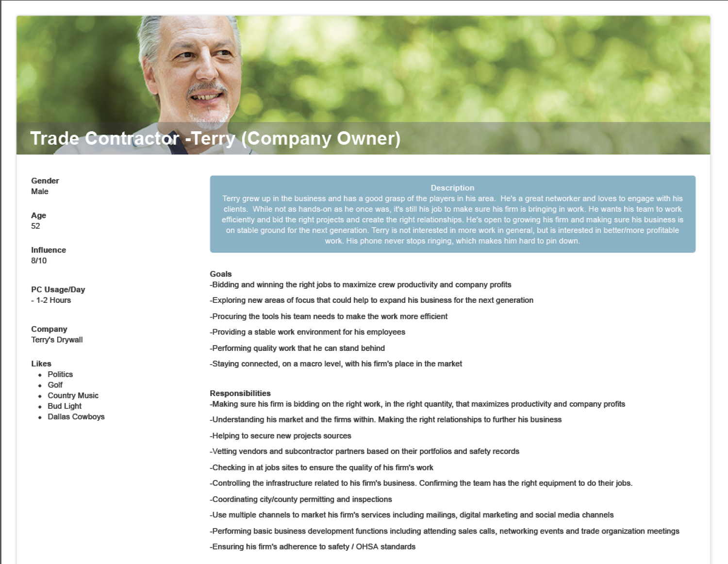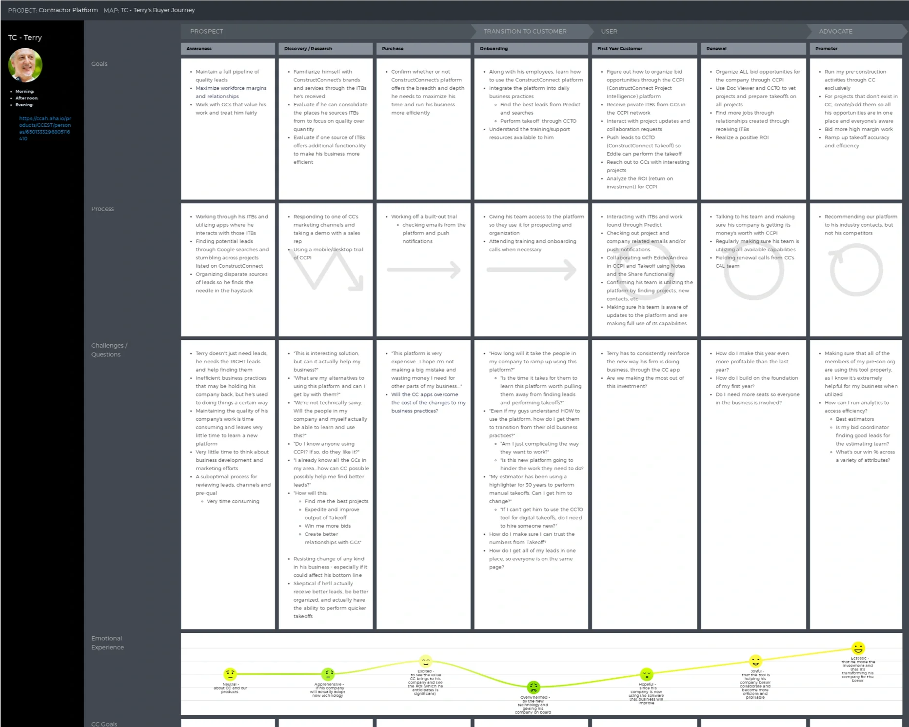 Customer interviews informed experience and journey maps of trade contractors’ bidding process, helping us identify pain points and tie CCPI roadmap items directly to persona needs like Terry’s.
