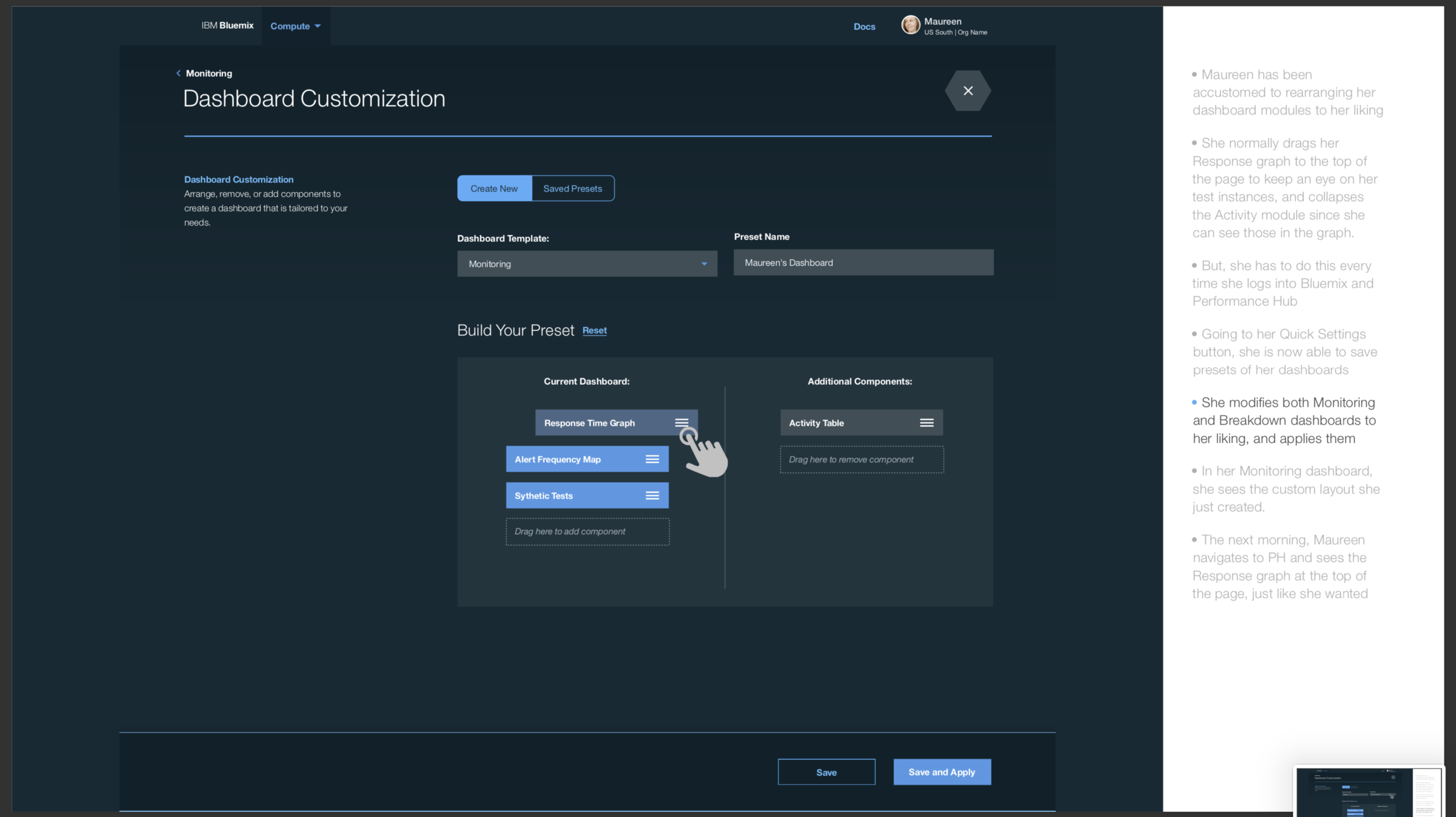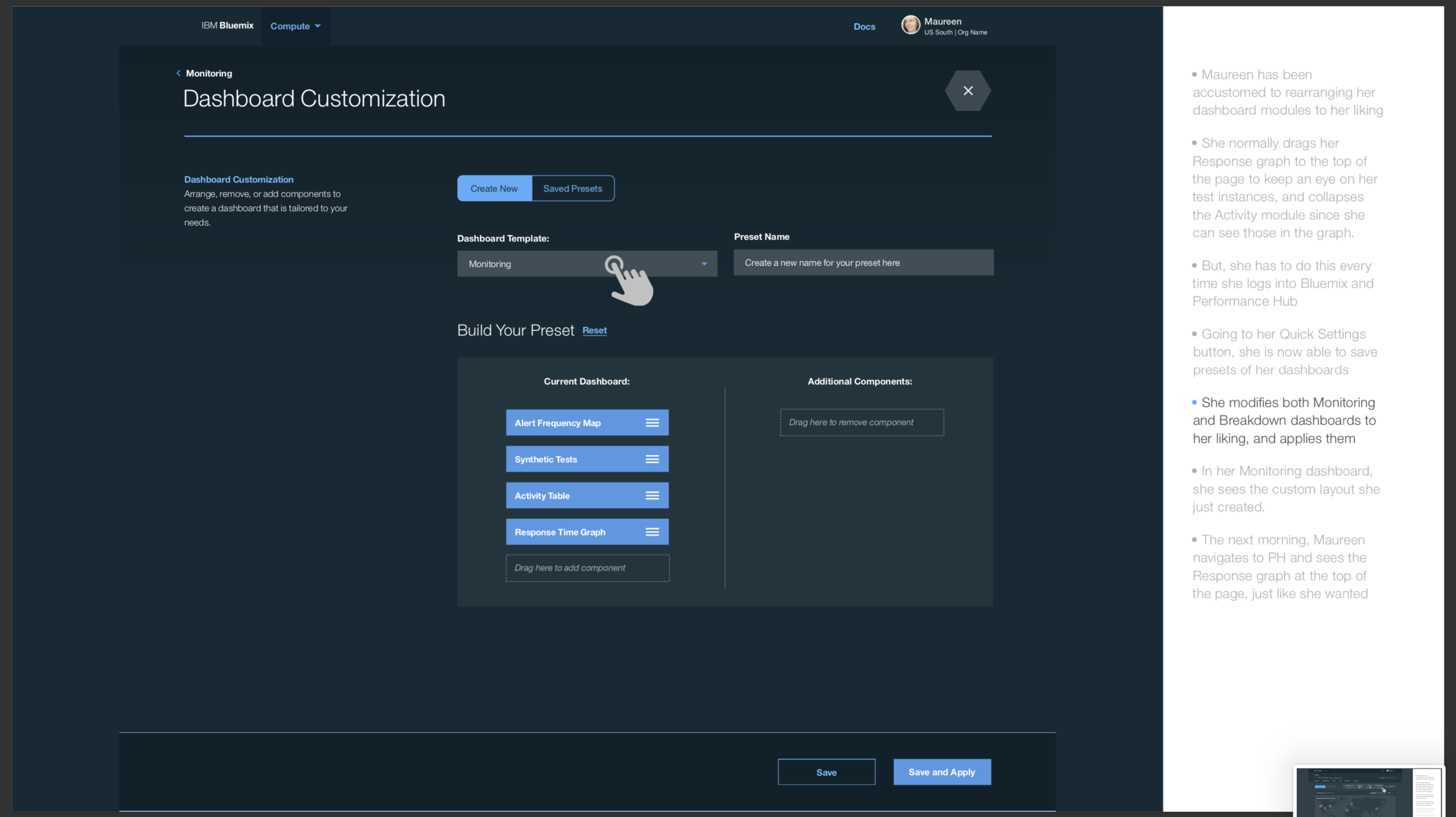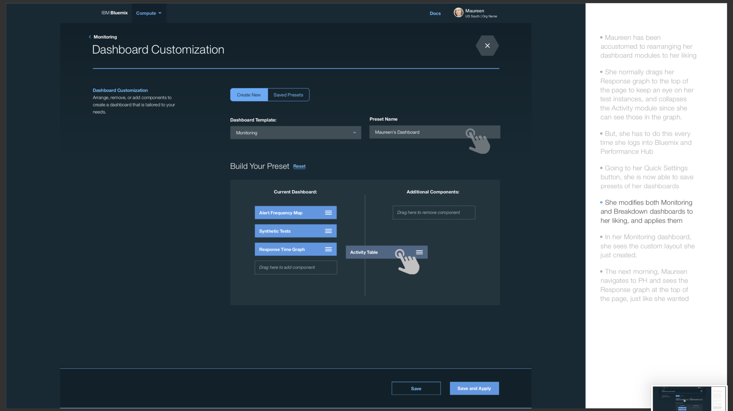 High-fidelity wireframes show Maureen using a custom dashboard to isolate a problem, built with IBM’s design system and style guide.