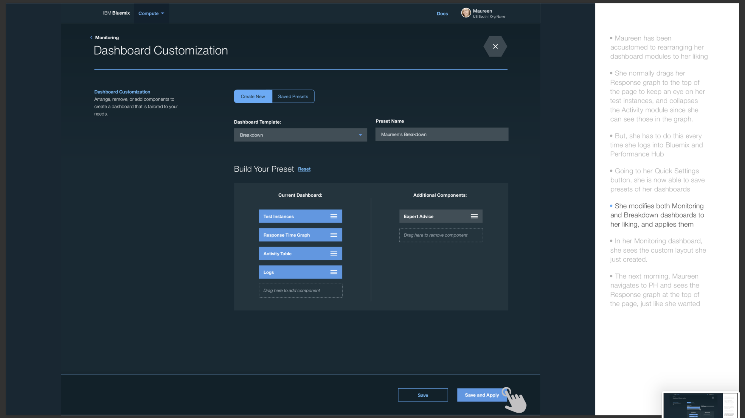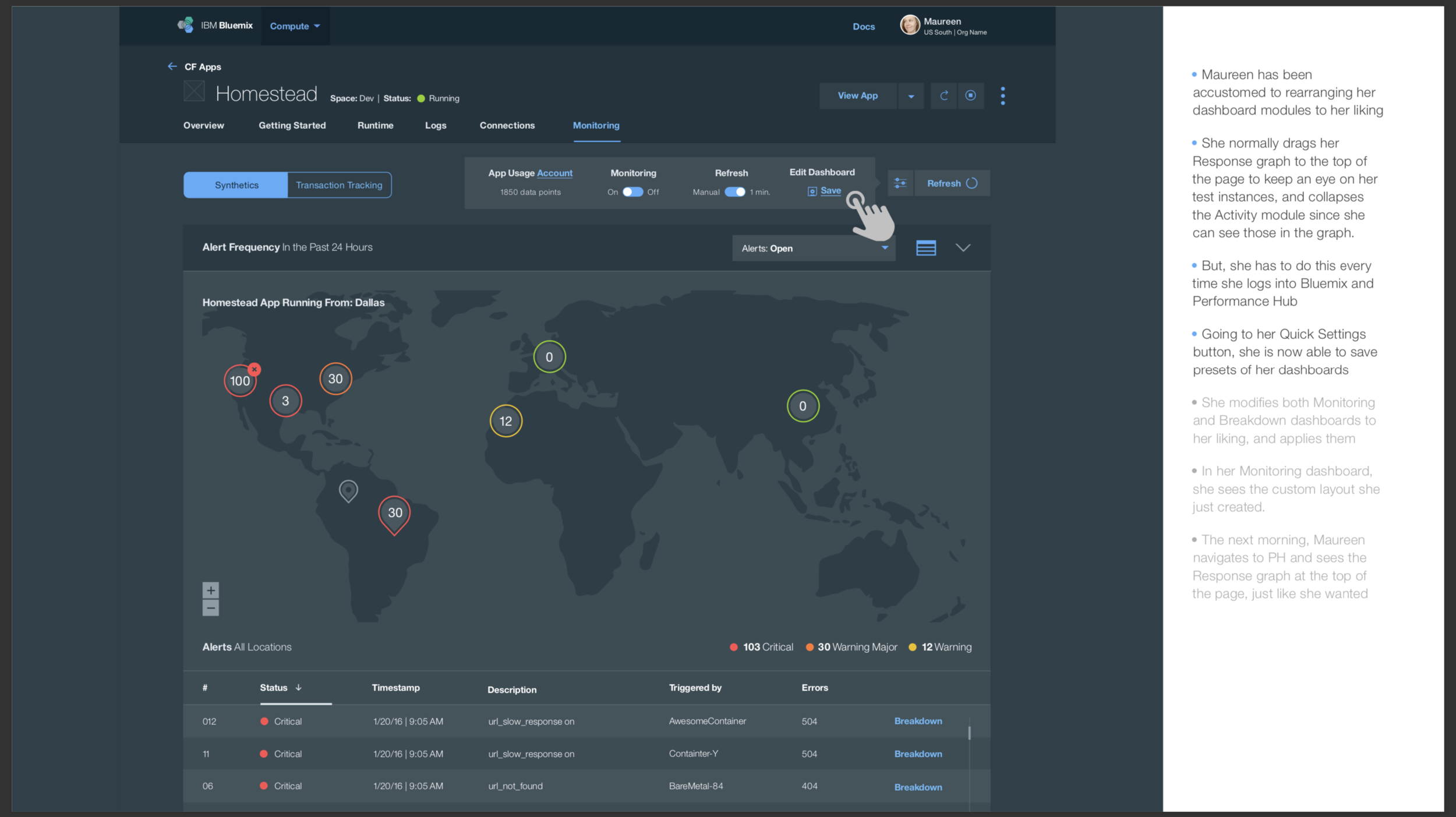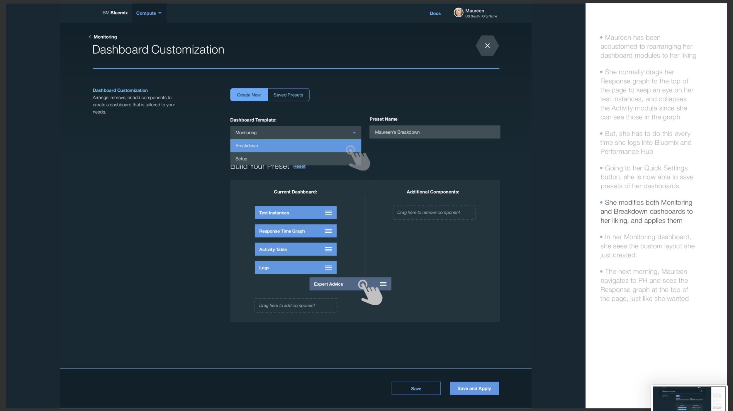 High-fidelity wireframes show Maureen using a custom dashboard to isolate a problem, built with IBM’s design system and style guide.