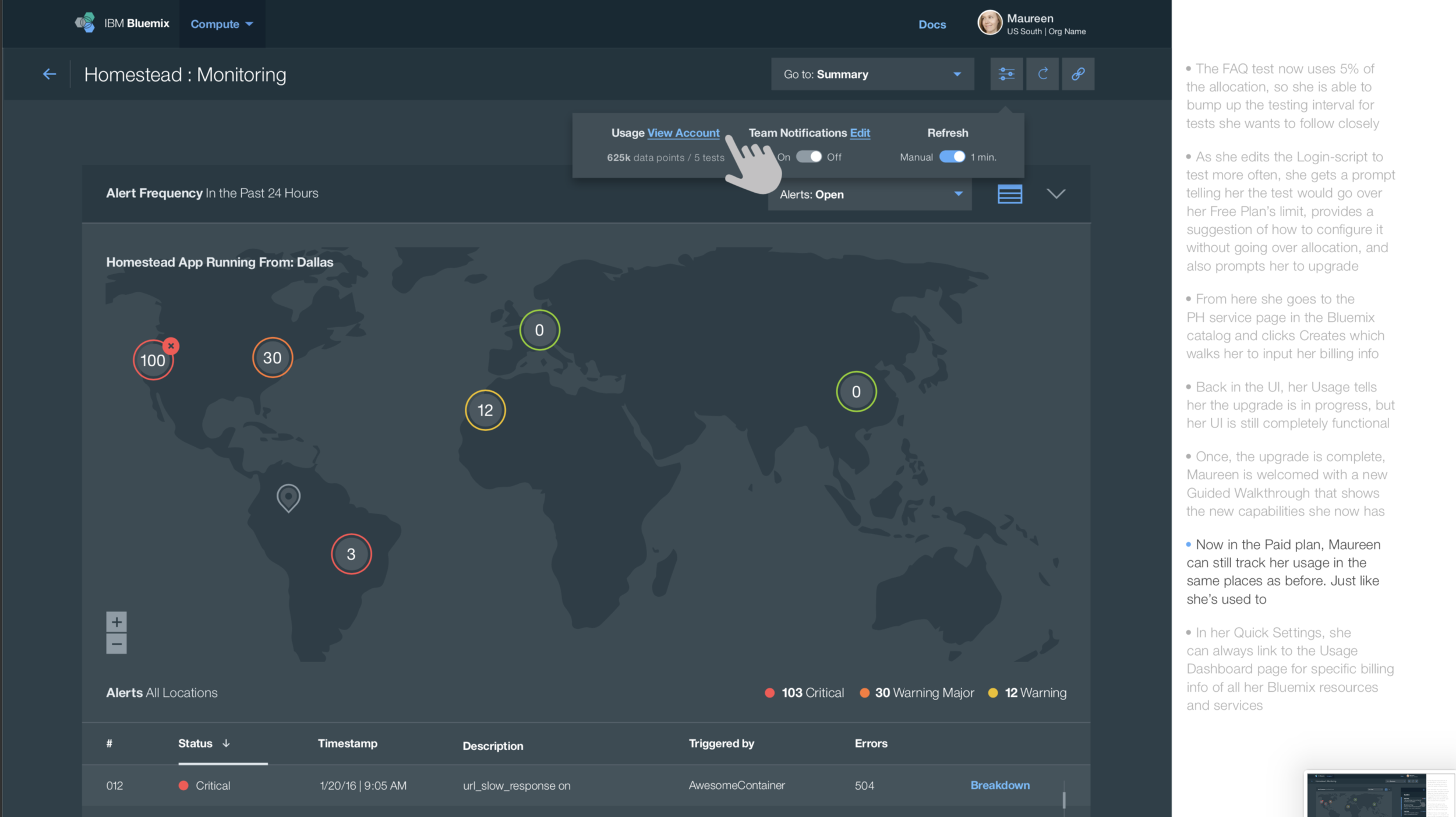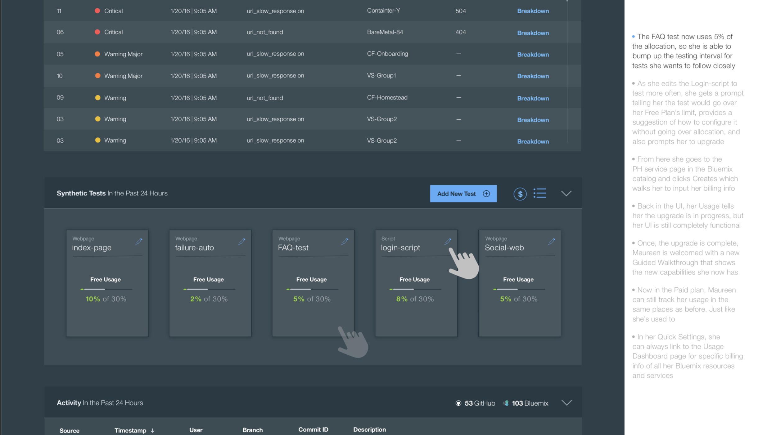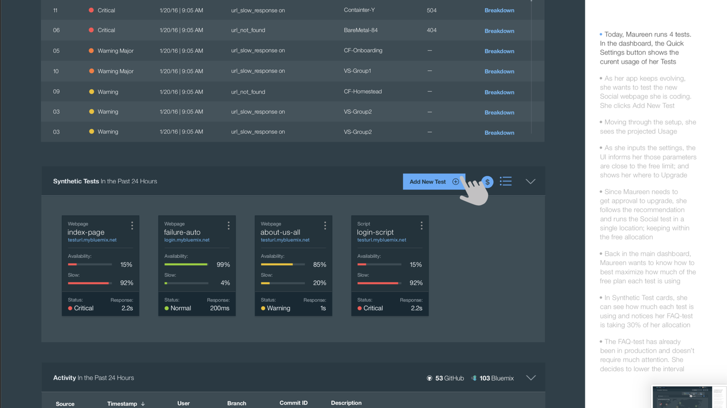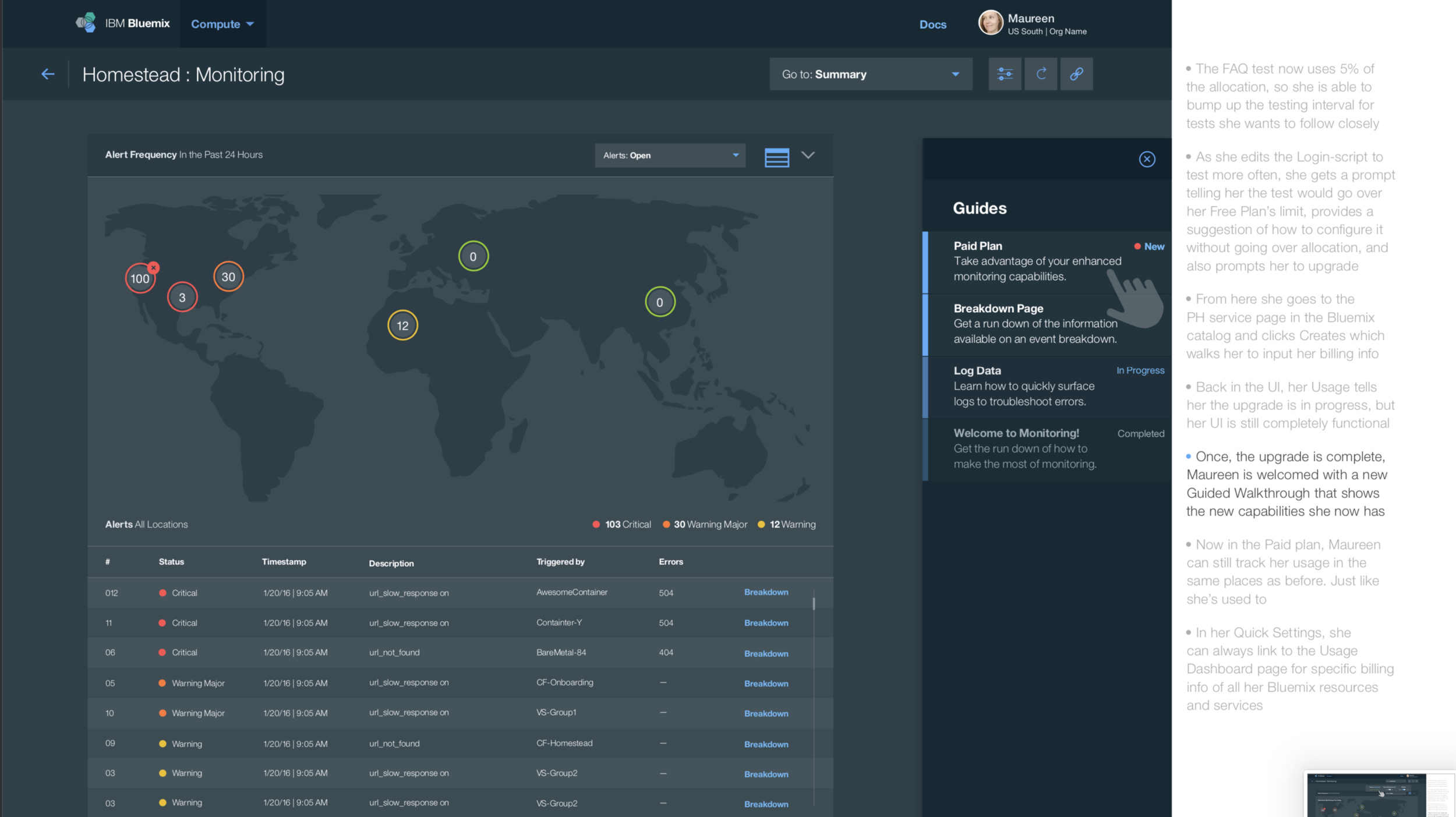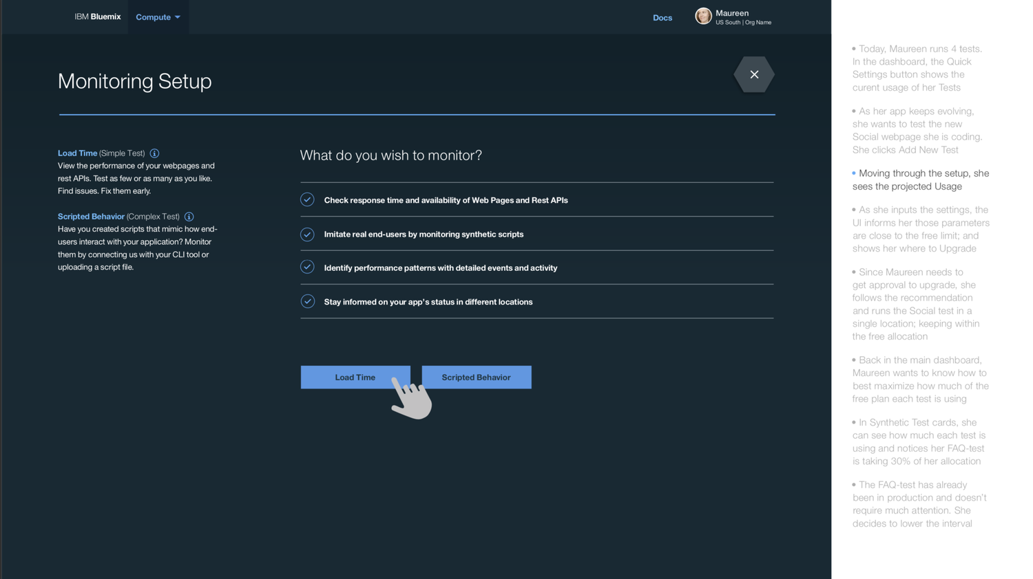 A DevOps user can quickly set up monitoring—seeing availability and response times within 20 minutes (5 on Bluemix)—and is guided to add more monitoring value over time.
