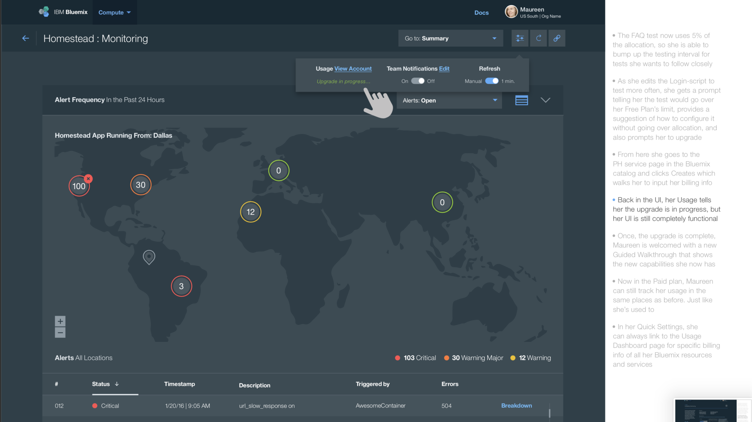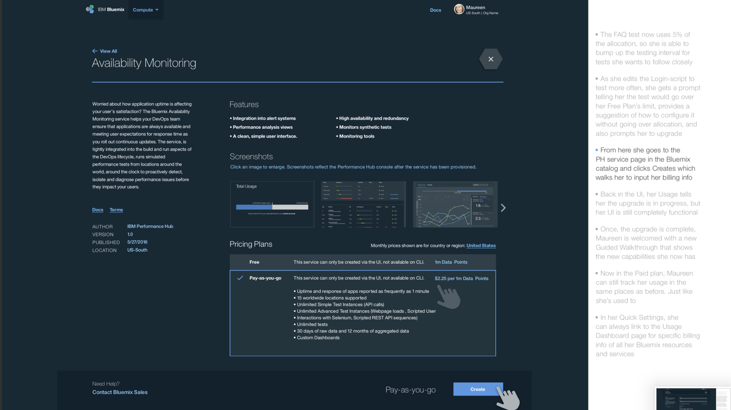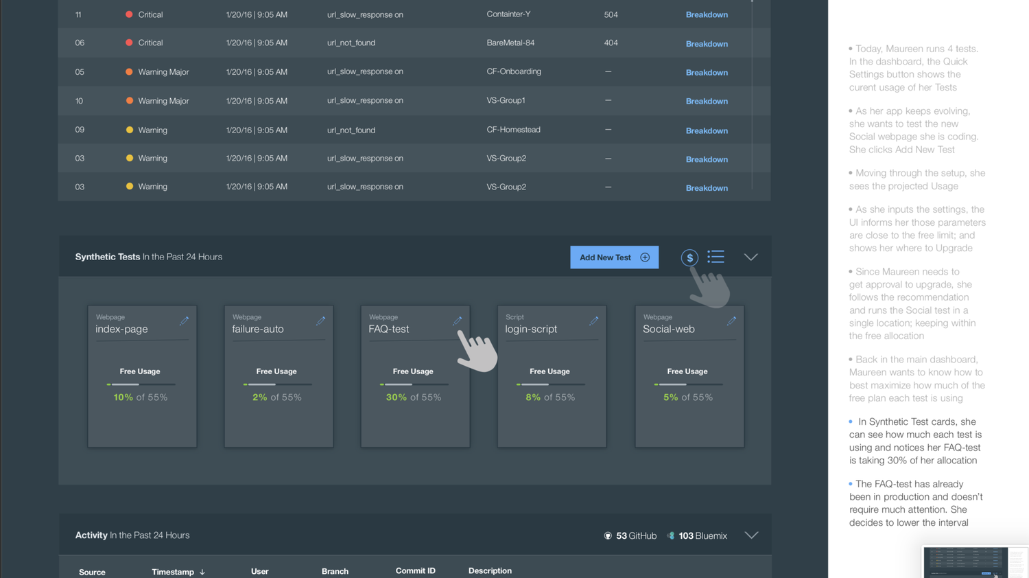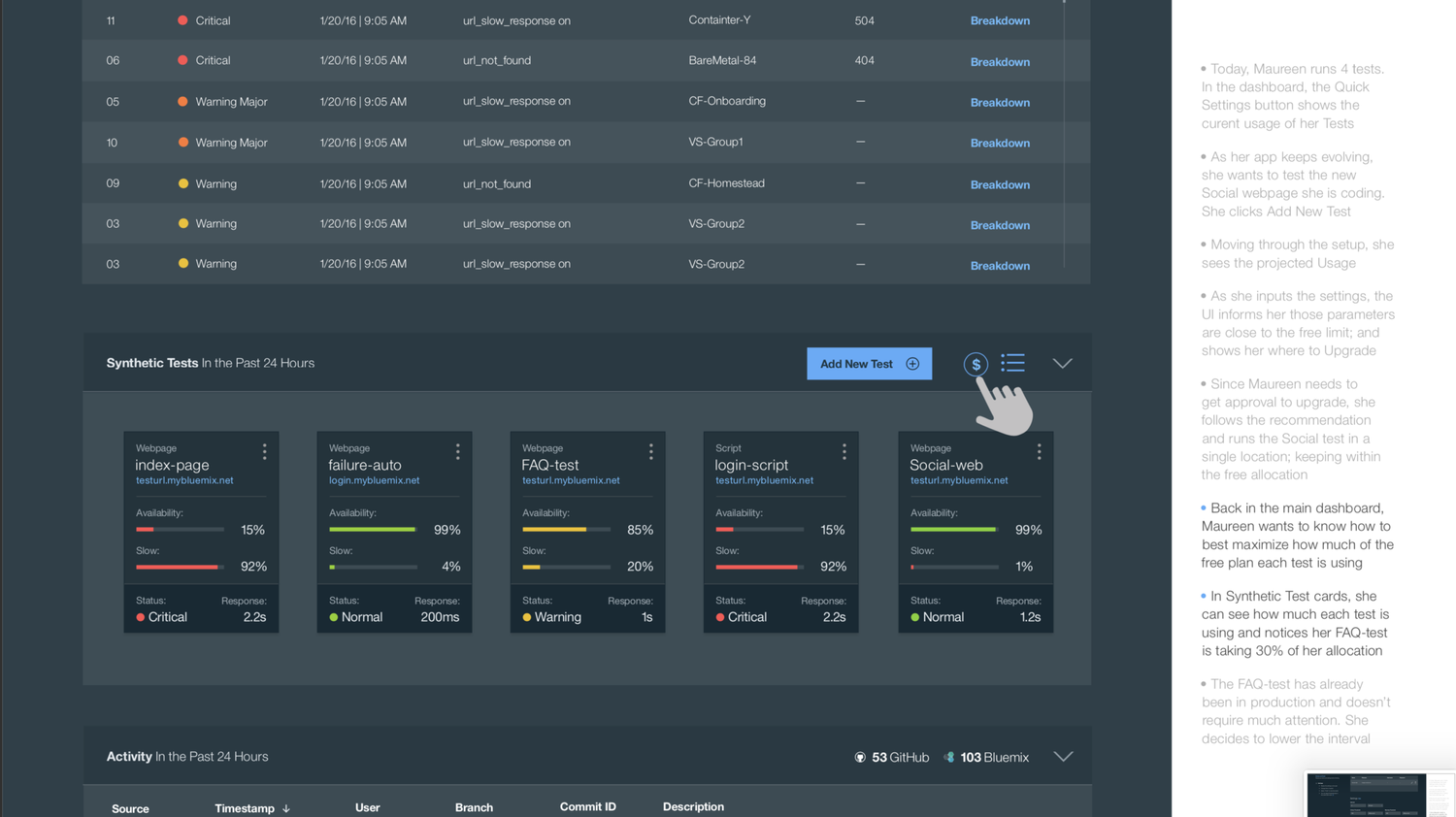 A DevOps user can quickly set up monitoring—seeing availability and response times within 20 minutes (5 on Bluemix)—and is guided to add more monitoring value over time.