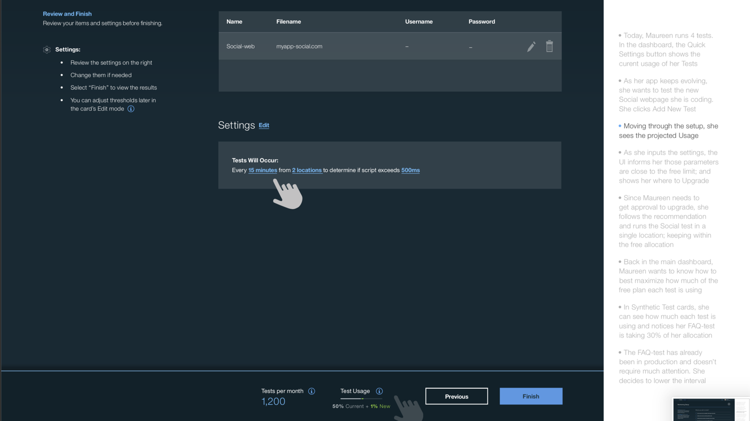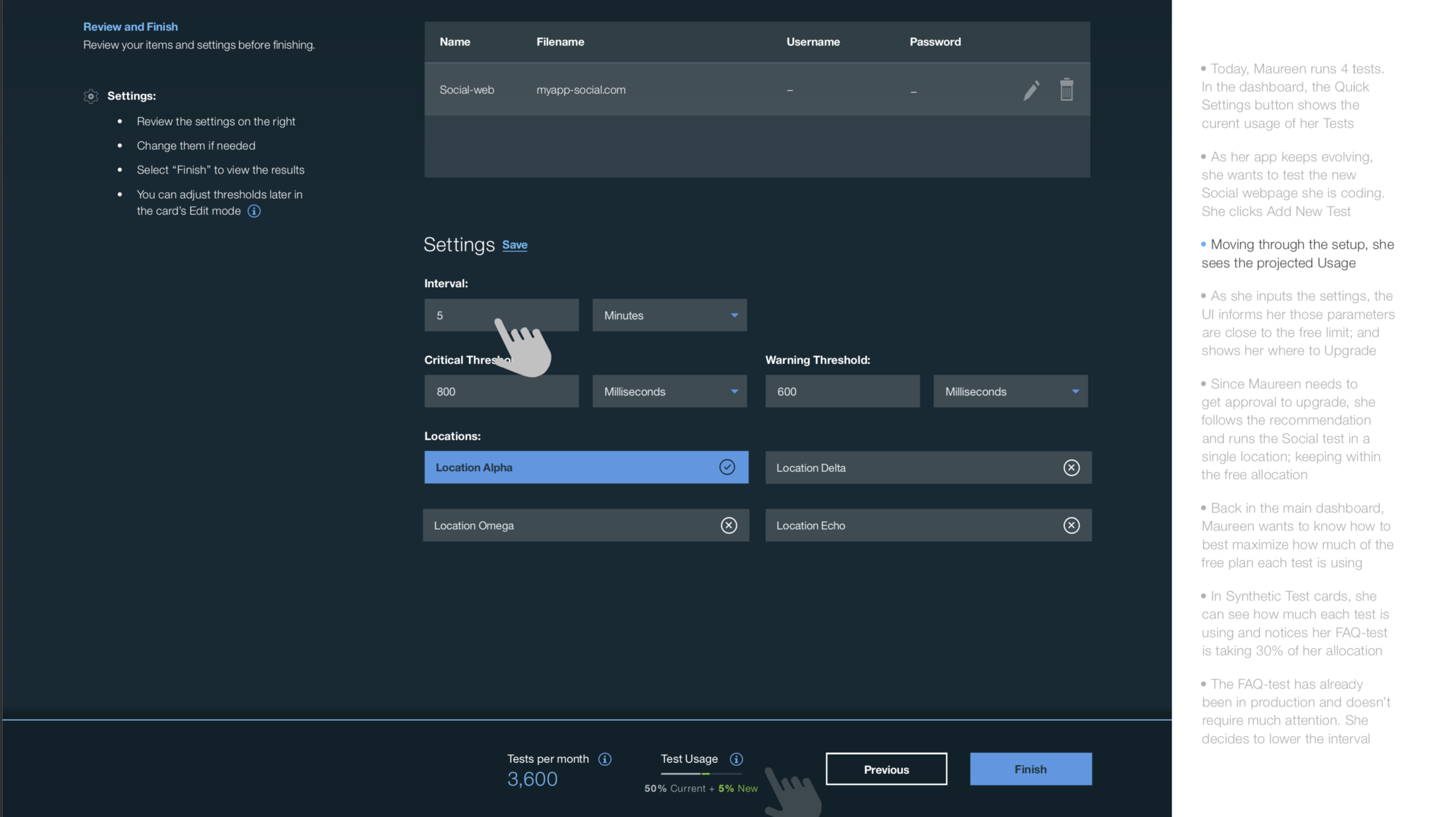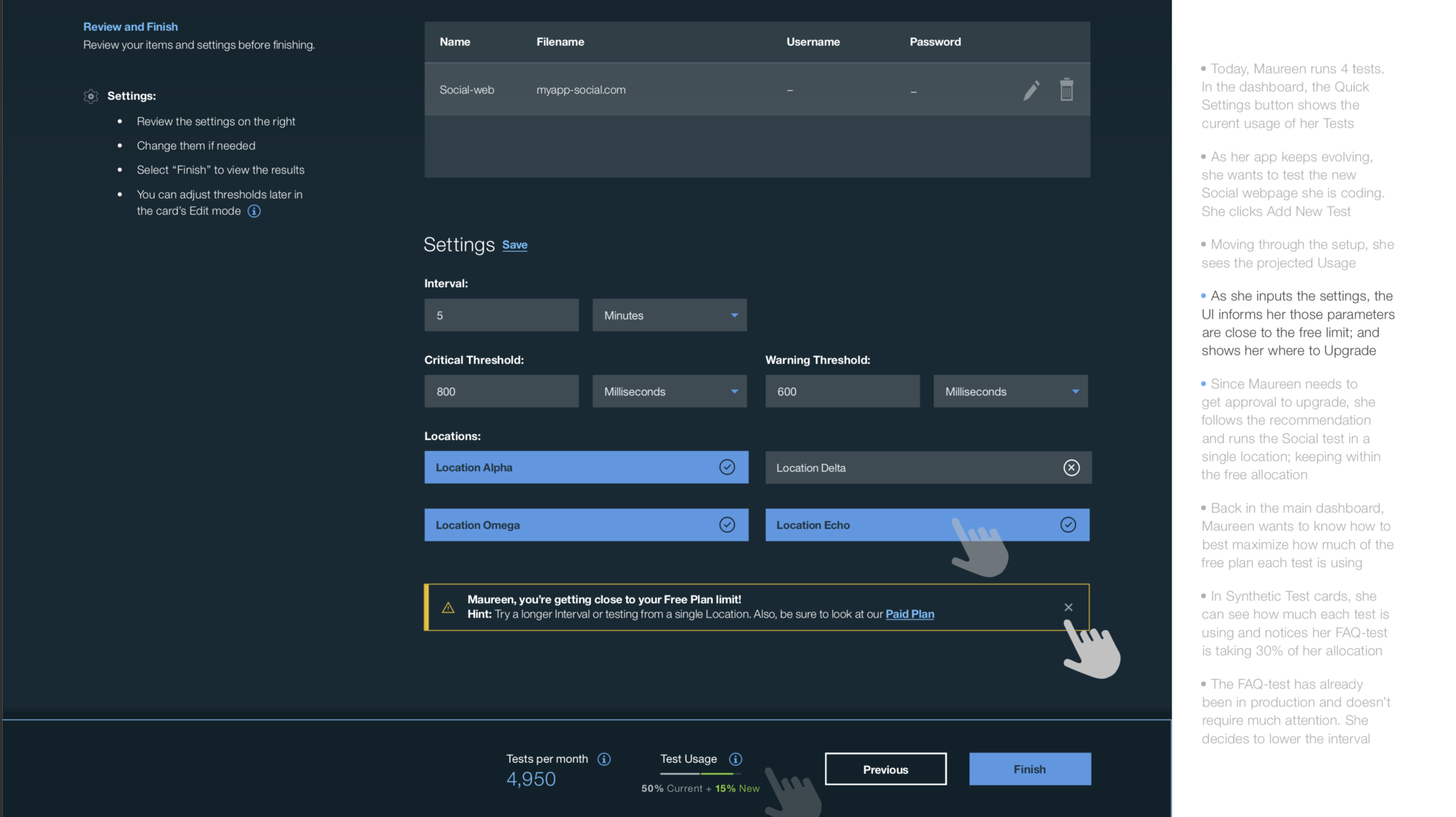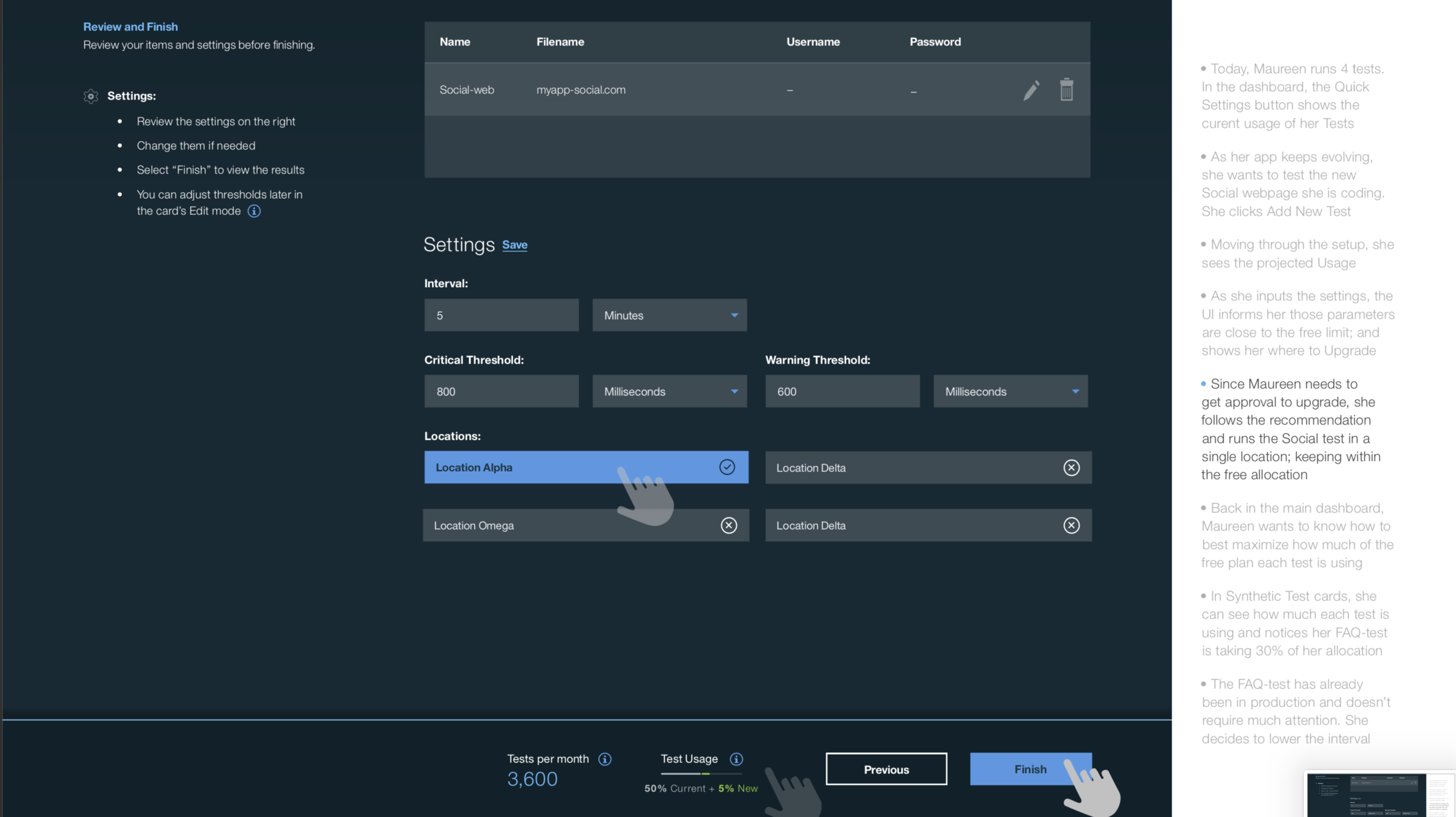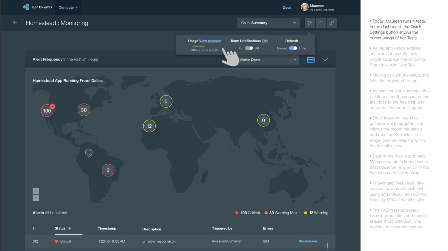 A DevOps user can quickly set up monitoring—seeing availability and response times within 20 minutes (5 on Bluemix)—and is guided to add more monitoring value over time.