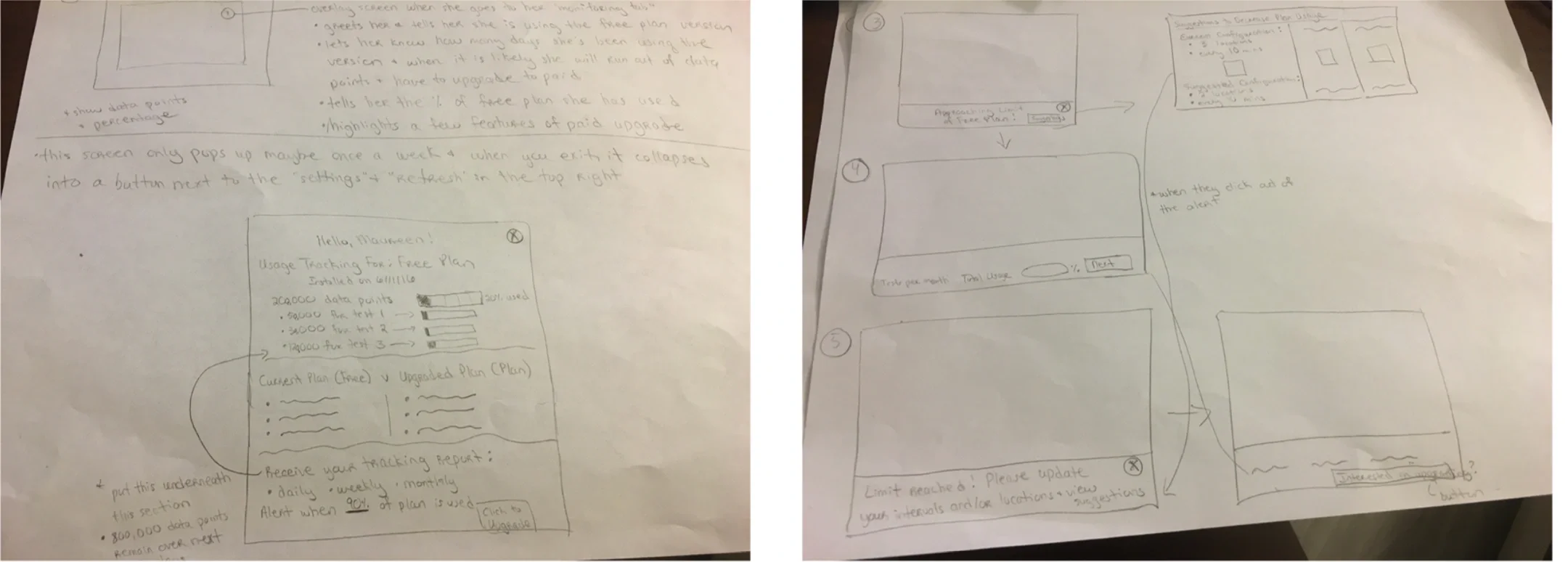 While designing for Hills #1 and #2, I began considering Maureen’s transition from free to paid APM for more space and advanced features. I sketched flows to explore key functionality and interactions.