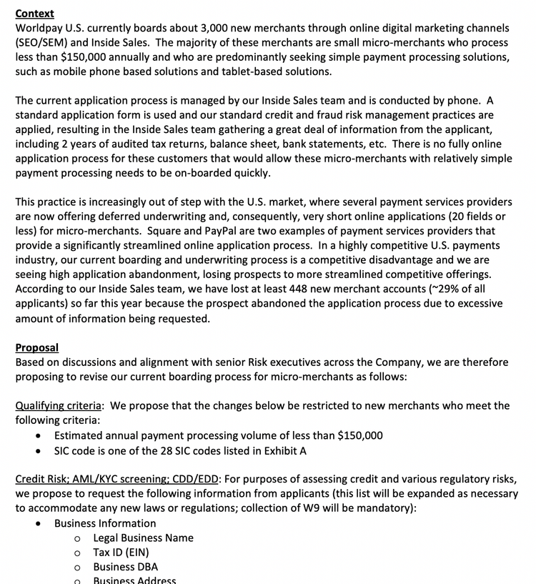 Background: Worldpay’s signup starts online but requires Inside Sales to finish by phone, collecting extensive documents like tax returns and bank statements. Unlike competitors such as Square and PayPal, Worldpay lacks a fully online, streamlined process—creating a competitive disadvantage and high application abandonment.